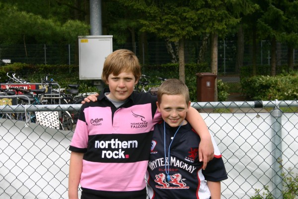 Een dagje rugby Tobias en Pepijn zitten allebeid op rugby bij de Haagsche Rugbyclub. Dat ze hier het shirt van de club niet aan hebben, komt omdat ze net weer bij Bart langs geweest zijn om nieuwe rugbyshirts te kopen. Inmiddels begint de klerenkast van de jongens steeds voller te raken met dit soort shirts. In ieder geval lekker voor de training, maar ook voor naar school. Tobias en Pepijn na afloop van de Oysters Rugbydagen